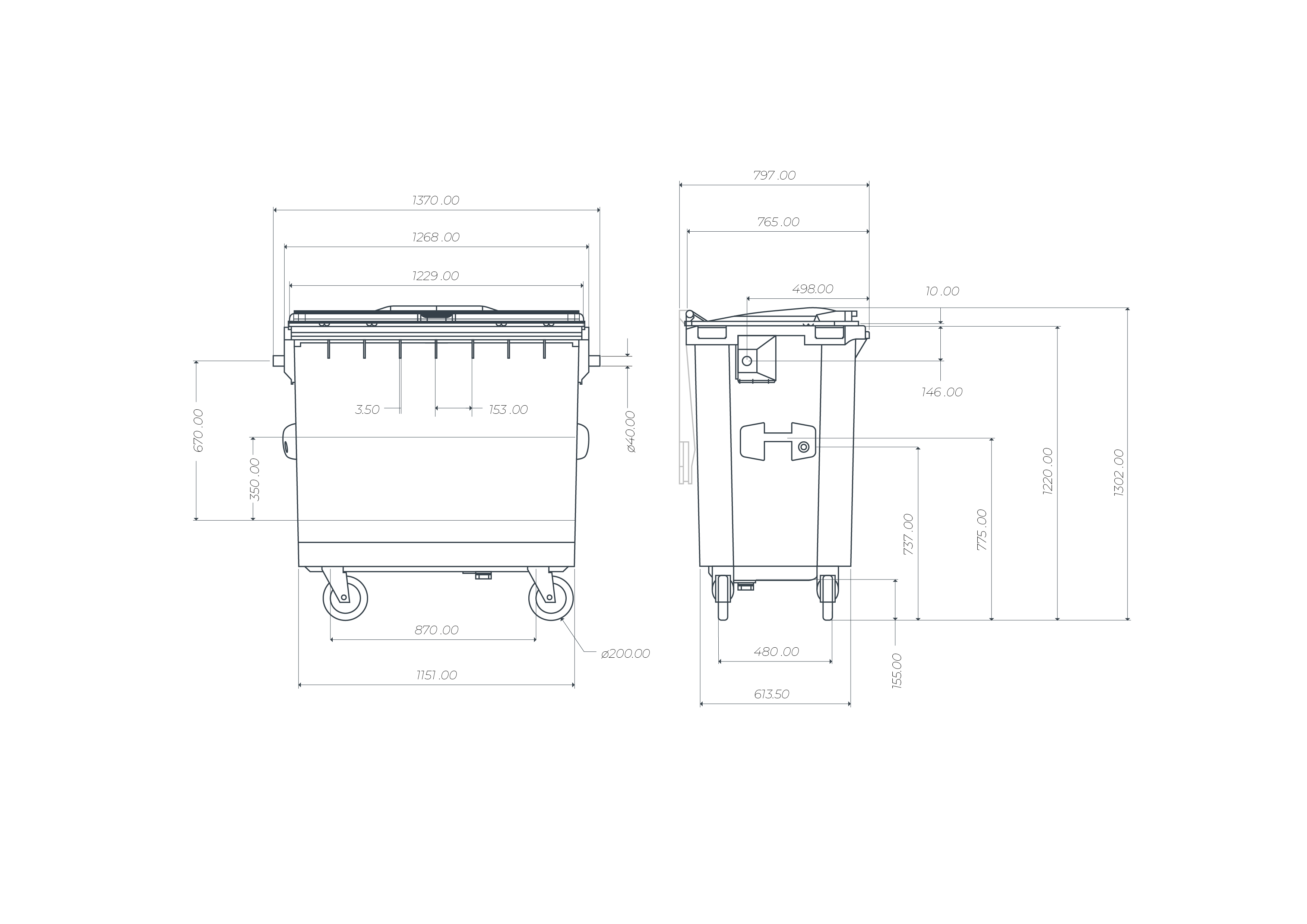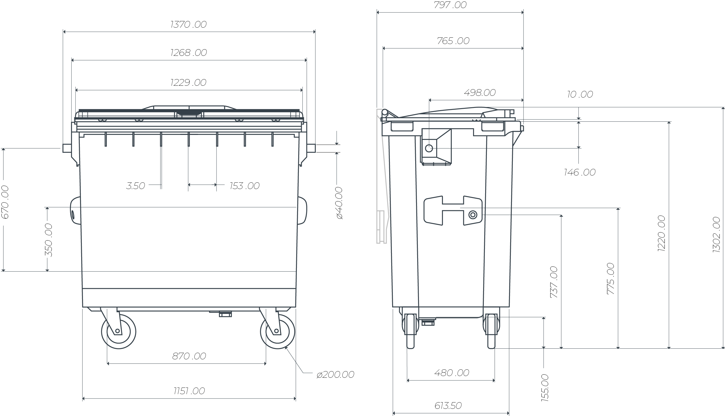 Kontejner se 4 koly z nichž 2 jsou vybavena brzdou, která zabraňuje jejich pohybu.